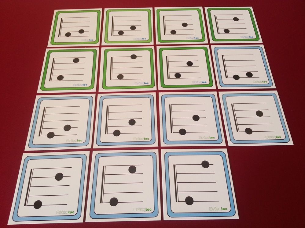 Conjunto formado por 15 cartelas em papel plastificado, tendo os principais intervalos da oitava musical impressos.